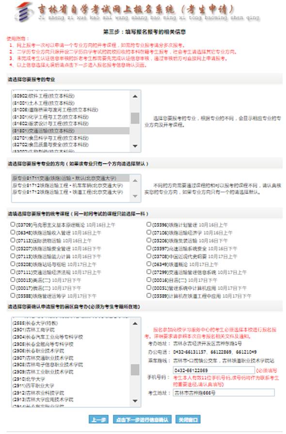 第四项是“请选择您要确认申请报考的县区自考办”,说明:必须为考生考籍所在地1.吉林铁道职业技术学院学生默认2917吉林铁道职业技术学院2.社会考生属吉林市昌邑区的默认为202昌邑区,属吉林省其他县区的点击当地县区名称)