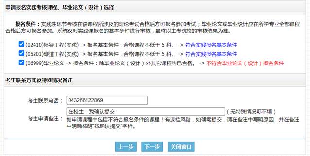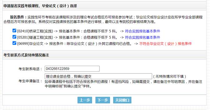4.生成吉林省实践环节考核、毕业论文(设计)网上报名申请表,考生可自行保存此页面(211批次所有专业考生成绩未全部合格的会出现异常提交,请不用理会);