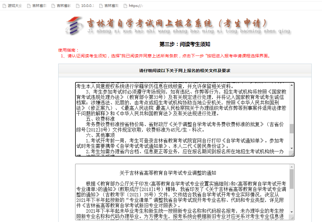 1. 网址:https://zkadm.jleea.com.cn/zk_bmsq。考生也可通过吉林省教育考试院官网(http://www.jleea.edu.cn)“自学考试网上报名”链接进入,点击“自考网上报名”进入“考生报考点击这里”界面,逐项填报。
