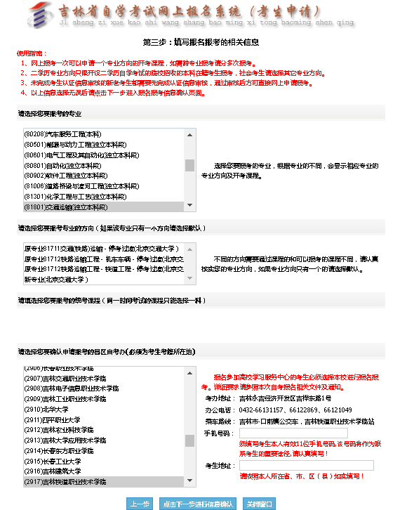 第四项是“请选择您要确认申请报考的县区自考办”,说明:必须为考生考籍所在地1.吉林铁道职业技术学院学生默认2917吉林铁道职业技术学院2.社会考生属吉林市昌邑区考试的默认为202昌邑区,属吉林省其他县区的点击当地县区名称);