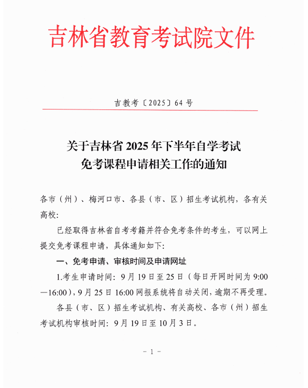 转发吉林省教育考试院关于吉林省2025年下半年自学考试免考课程申请相关工作的通知