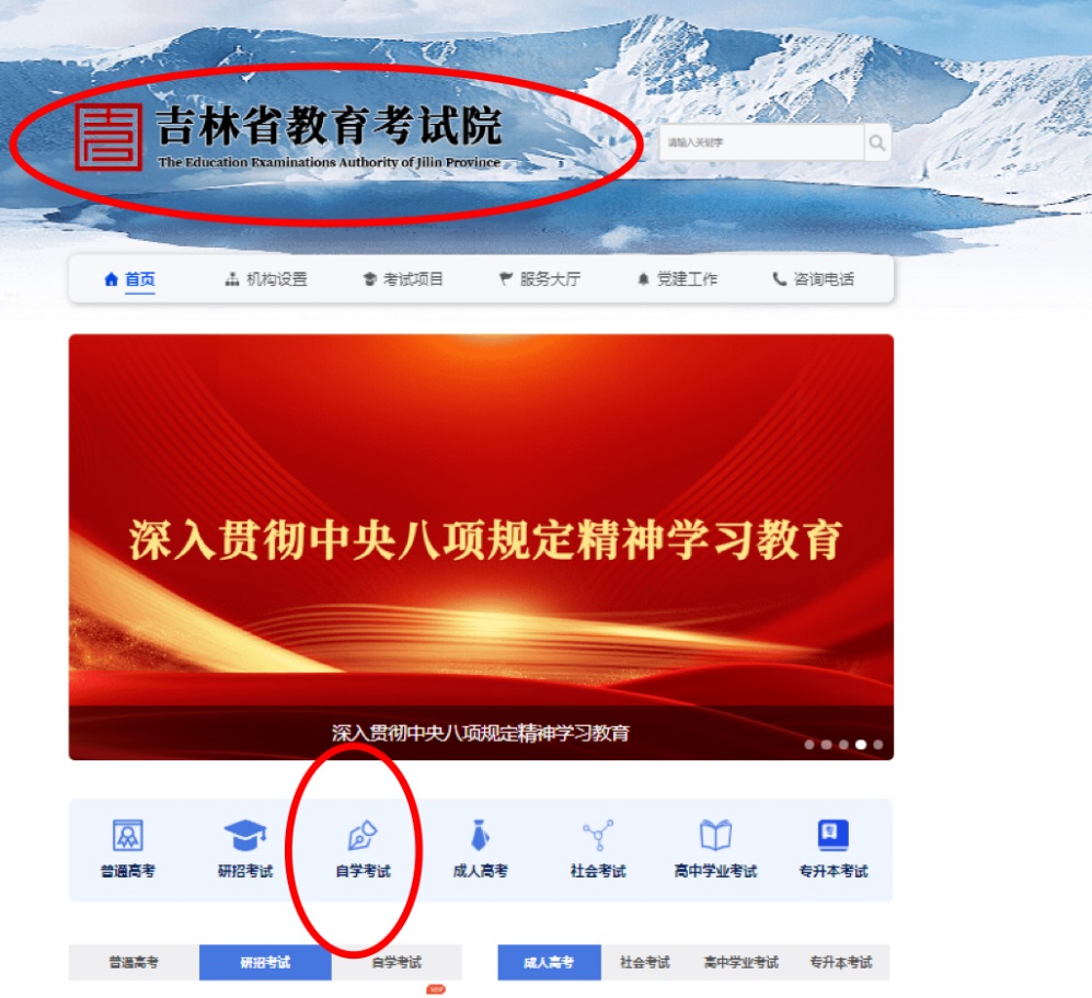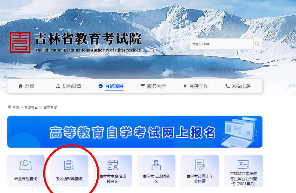 4.在首页上选择自学考试,点击进去之后选择考试通知单查询。