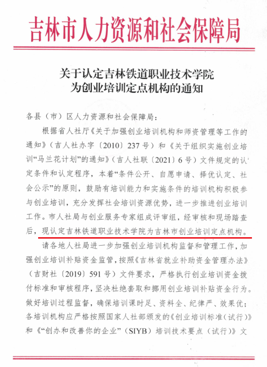 近日,吉林市人力资源和社会保障局发布了《关于认定吉林铁道职业技术学院为创业培训定点机构的通知》,我校被认定为创业培训定点机构。学校历来高度重视社会培训和服务工作,充分发挥职业教育品牌优势,优化整合教学团队,利用社会培训资源,通过积极申报,经过材料初审、专家现场考核和评审,最终顺利获批。